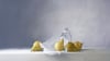 This serene still life captures four golden pears arranged on a rumpled white cloth, with a glass jar standing quietly in the background. The artist has rendered each element with careful attention to light and shadow, creating a soft, almost dreamy atmosphere that feels both contemporary and timeless. The muted gray background gradually lightens from left to right, giving the whole scene a gentle, meditative quality.