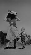 This powerful photograph captures a moment of arrival and determination as a woman carrying a suitcase on her head walks alongside a young boy in Haifa, Israel. Shot in stark black and white, the image conveys both hardship and hope. The woman's posture, balancing her belongings while moving forward, speaks to the resilience required of those starting over in a new land. The small boy at her side, dressed in suspenders and appearing slightly uncertain, adds an emotional layer to this scene of displacement and new beginnings. Robert Capa, one of the 20th century's most celebrated photojournalists, documented some of history's most pivotal moments, from the Spanish Civil War to D-Day. Here, he turns his lens to the waves of Jewish immigration to Palestine in the 1940s, a time of massive upheaval and transformation in the region. His documentary approach captures the human reality behind historical events, focusing on individual stories rather than grand narratives. What makes this image so compelling is its honesty and simplicity. There's no dramatization, just a straightforward moment that reveals so much about the immigrant experience. The sparse landscape and simple clothing remind us that these journeys often began with little more than what could be carried, yet the forward motion of the figures suggests an unwavering commitment to building a new future.