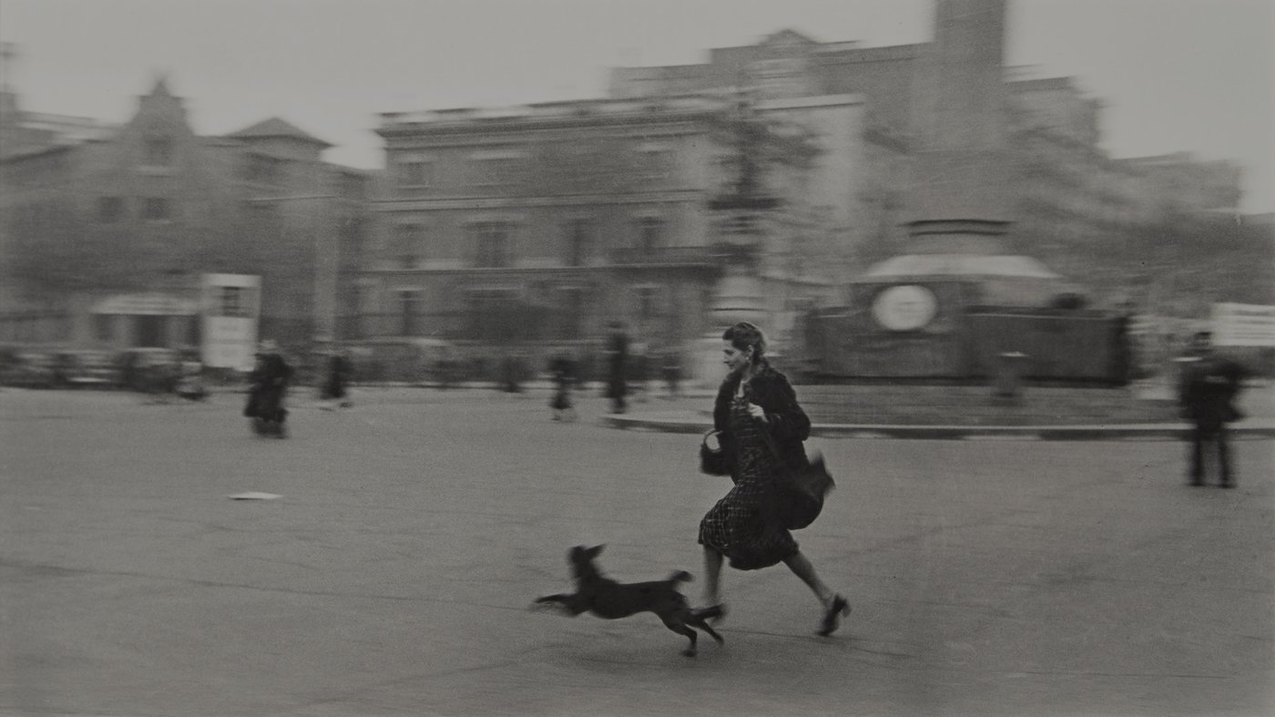 This striking photograph captures a fleeting moment of fear and survival during the Spanish Civil War in Barcelona. A woman runs across an open plaza with her dog, rushing to find safety during an air raid. The blurred background and sense of motion convey the urgency and chaos of wartime life for ordinary civilians caught in the conflict. The image reminds us that war isn't just about soldiers and battles, but about everyday people trying to survive. Robert Capa, the legendary war photographer, took this image in 1939 as the Spanish Civil War was nearing its devastating end. Capa became famous for his unflinching documentation of conflict, living by his famous motto: "If your pictures aren't good enough, you're not close enough." This photograph shows his commitment to that philosophy, capturing an intimate human moment amid the broader tragedy of war. The composition, with the running figures silhouetted against the architectural backdrop, creates a powerful visual document of a city under siege.