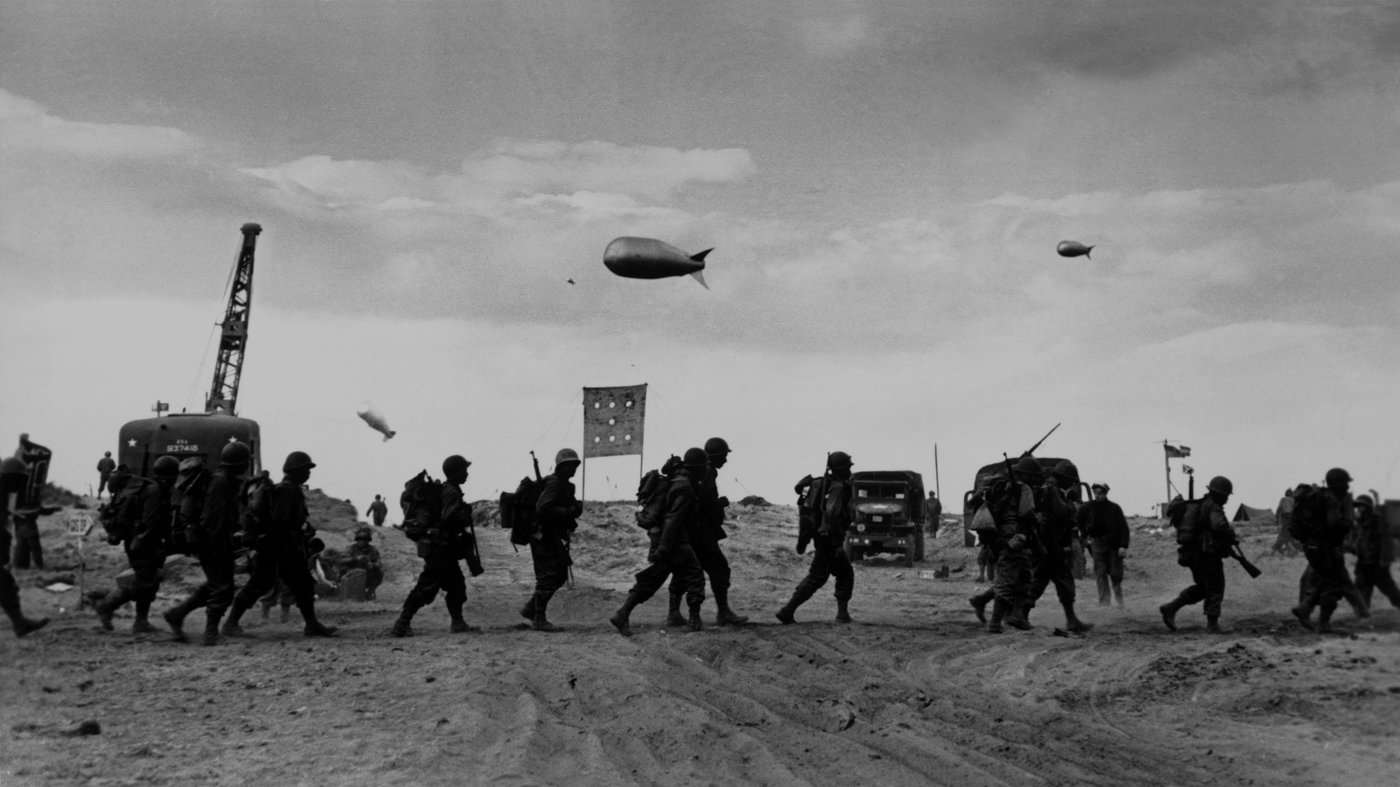 This striking photograph captures American troops wading through the shallow waters of Omaha Beach on D-Day, June 6, 1944. Taken by legendary war photographer Robert Capa, who landed with the first wave of soldiers, the image conveys the chaos and danger of that historic morning. The blurred, grainy quality isn't a stylistic choice but rather the result of Capa shooting with wet hands while under fire, and later damage during the developing process when a darkroom assistant accidentally melted most of the film in his haste to see the images. Only eleven frames survived from Capa's original 106 photographs. The barrage balloons floating overhead were used to deter enemy aircraft, while the soldiers' hunched postures and the general haziness of the scene convey the fear and confusion of the moment. Capa's close proximity to the action, so close that he could have been hit at any moment, gives this photograph an immediacy that few war images achieve. The technical imperfections, rather than diminishing the photograph's power, actually enhance it, creating a dreamlike quality that somehow makes the brutality of war even more palpable. This image became one of the most iconic photographs of World War II.