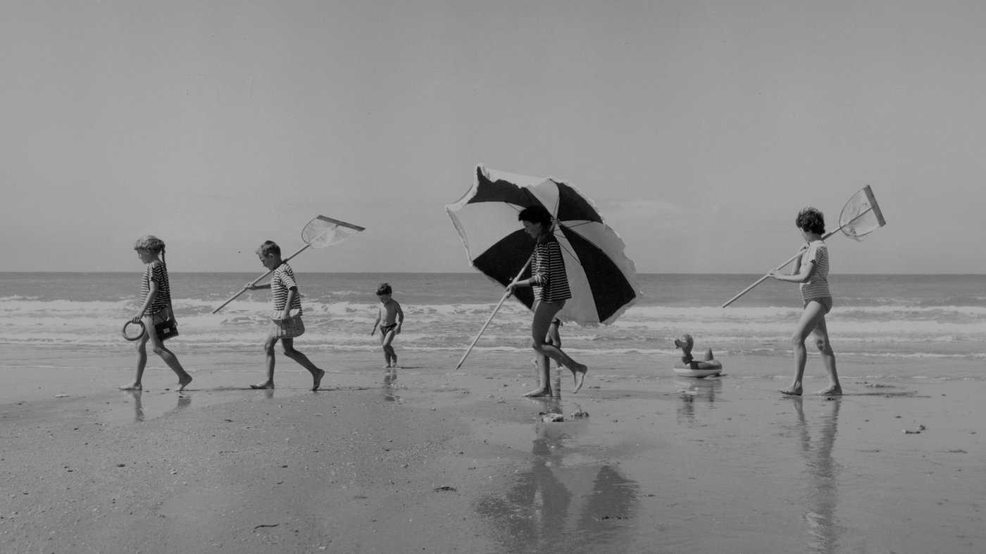 This charming black and white photograph captures a timeless summer scene on a French beach, where a family walks in single file along the wet sand at low tide. Each figure carries fishing nets on poles, ready for the day's catch, while one person struggles with a large striped umbrella caught by the coastal breeze. A small child sits contentedly in the shallow water, completing this snapshot of simple seaside pleasures. The composition creates a wonderful rhythm as the silhouettes move from left to right across the frame, their reflections mirrored in the glistening sand below. Robert Doisneau, one of France's most beloved photographers, had an exceptional talent for finding poetry in everyday moments. Shot at Penestin, a small seaside village in Brittany, this image showcases his signature style of gentle observation and understated humor. The photograph feels both spontaneous and perfectly composed, capturing the unhurried pace of a French beach vacation in the mid-20th century. There's something wonderfully nostalgic about this scene, a reminder of simpler times when a day at the beach meant catching your own dinner and battling stubborn umbrellas rather than scrolling through phones.