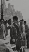 This famous photograph captures a young couple kissing on a busy Parisian street in 1950, embodying the romance and energy of post-war France. Shot by Robert Doisneau, one of France's most beloved street photographers, the image shows lovers lost in their own moment while city life bustles around them. The soft focus of the background and the crisp detail of the embracing pair creates a dreamy, cinematic quality that made this one of the most iconic photographs of the 20th century.