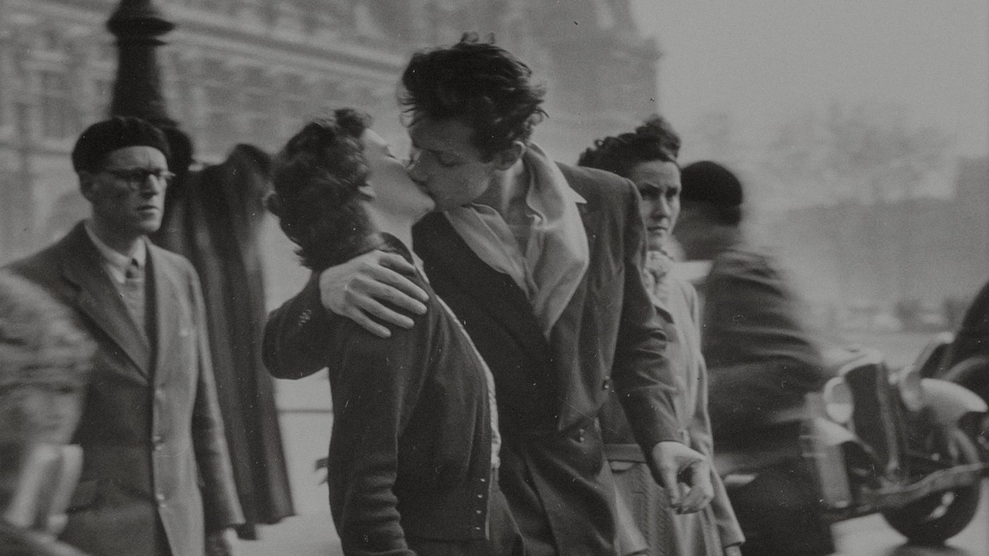 This famous photograph captures a young couple kissing on a busy Parisian street in 1950, embodying the romance and energy of post-war France. Shot by Robert Doisneau, one of France's most beloved street photographers, the image shows lovers lost in their own moment while city life bustles around them. The soft focus of the background and the crisp detail of the embracing pair creates a dreamy, cinematic quality that made this one of the most iconic photographs of the 20th century.