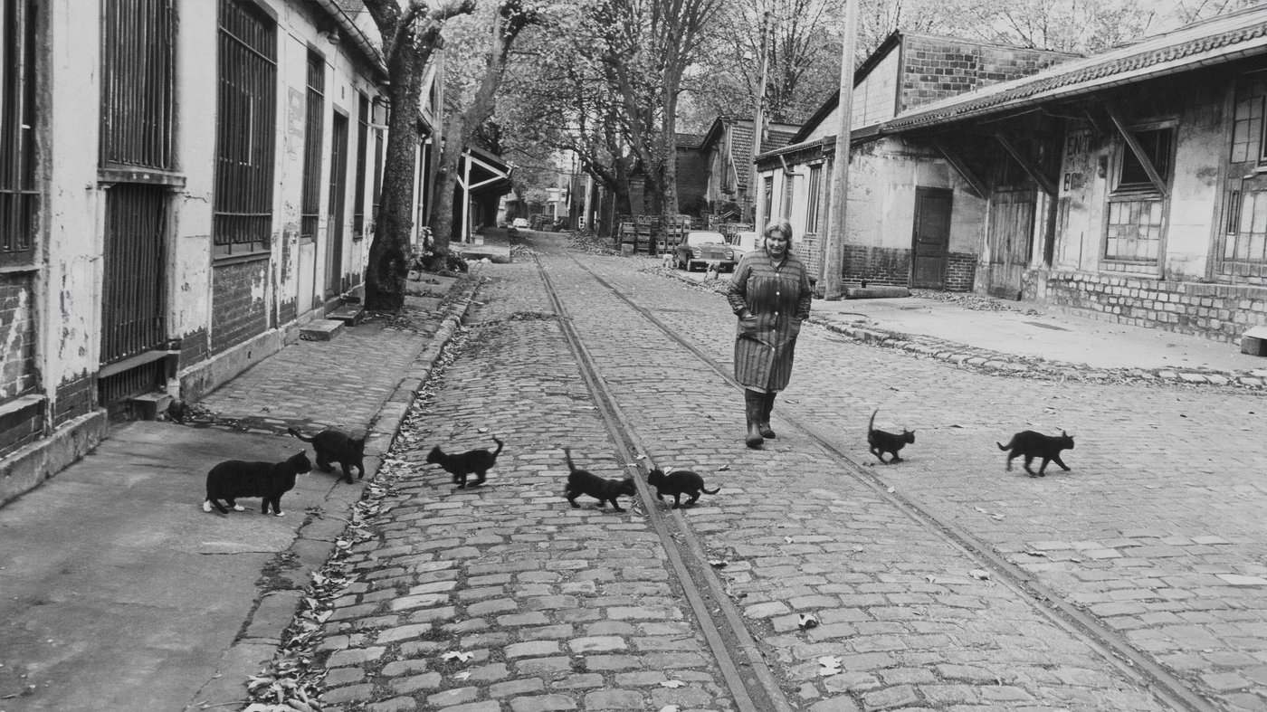 This charming street scene captures a woman leading a parade of black cats down a cobblestone road in Paris's Bercy district, photographed by Robert Doisneau in the 1970s. The French photographer was famous for finding poetry in everyday Parisian life, and this image perfectly shows his eye for the unexpected and humorous. The cats follow obediently behind like ducklings, creating a wonderfully surreal moment on an otherwise ordinary street lined with modest buildings and old tram tracks.