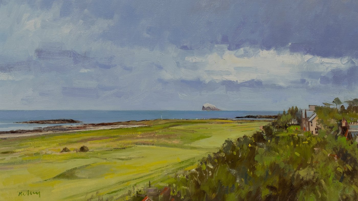 Robert Kelsey brings a contemporary impressionist approach to this traditional Scottish subject. His handling of the greens is particularly effective, using varied shades of yellow and lime to suggest the wind-swept grasses and undulating terrain that make links golf so challenging and atmospheric. The coastal light, filtered through those characteristic Scottish clouds, gives the whole scene a fresh, breezy quality that anyone who's walked these shores will immediately recognize. It's a painting that captures not just a place, but the feeling of being there on a typical day by the Firth of Forth.