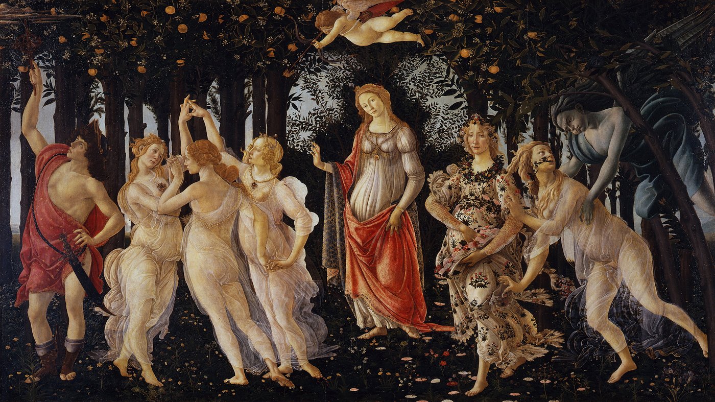 In this enchanting Renaissance masterpiece by Botticelli, we're transported to a mythical orange grove where nine figures dance and pose in an eternal celebration of spring. At the center stands Venus, the goddess of love, while Cupid hovers above her with his bow aimed at the Three Graces, who dance in sheer, flowing garments. To the right, the wind god Zephyr pursues a nymph who transforms into Flora, the goddess of flowers, shown scattering blossoms across the scene. Mercury, recognizable by his winged sandals, stands to the left dispersing clouds with his staff.