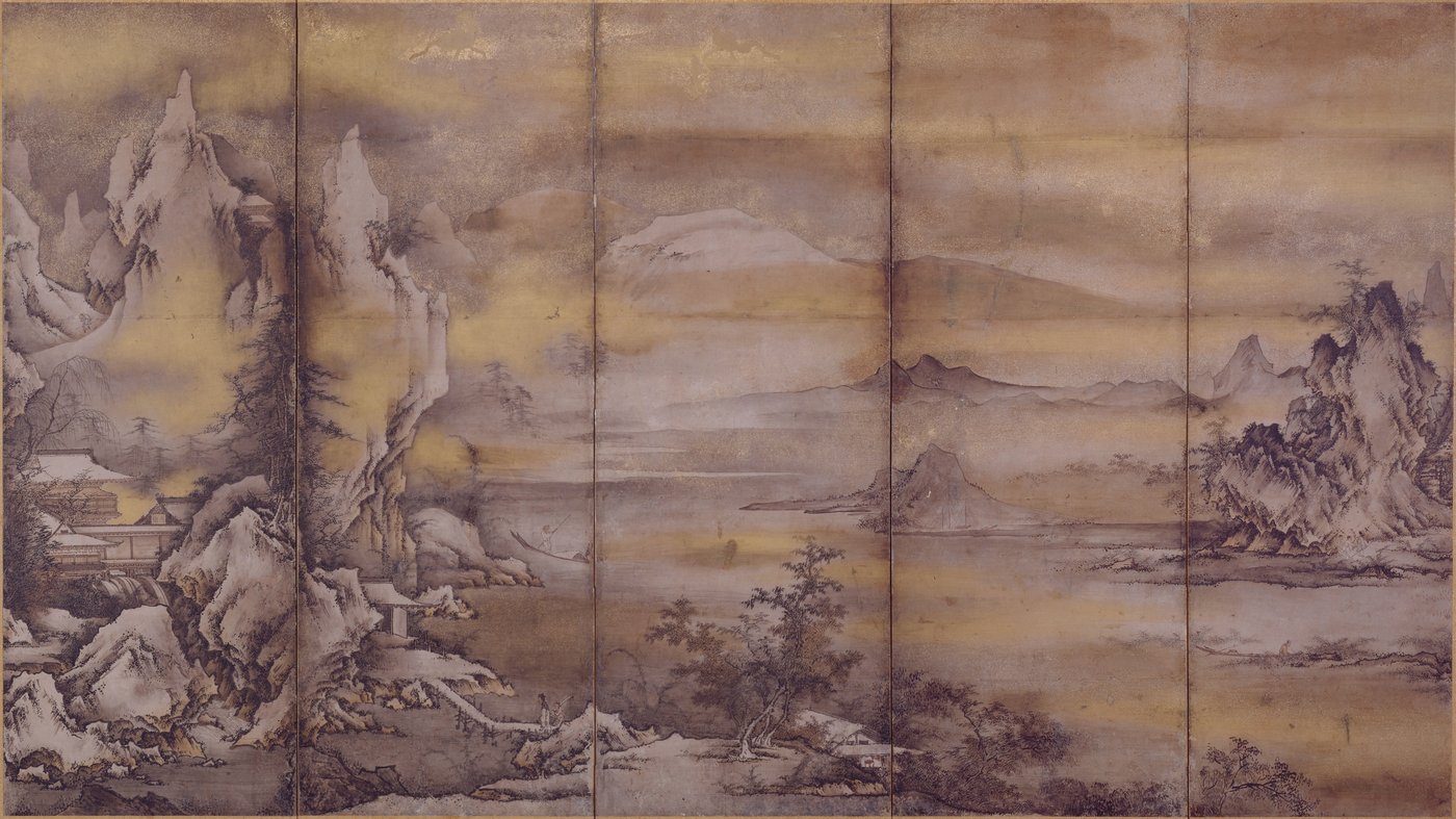 This serene Japanese folding screen captures the gentle progression of seasons across a misty mountain landscape. Created by Shikibu Terutada, the work exemplifies the traditional ink wash painting technique that was highly prized in Japanese art. The composition flows from left to right across the panels, with jagged peaks emerging from soft clouds and water, while sparse trees anchor the scene to earth. The muted palette of grays and gentle golds creates an almost dreamlike atmosphere where land, water, and sky blend seamlessly together.