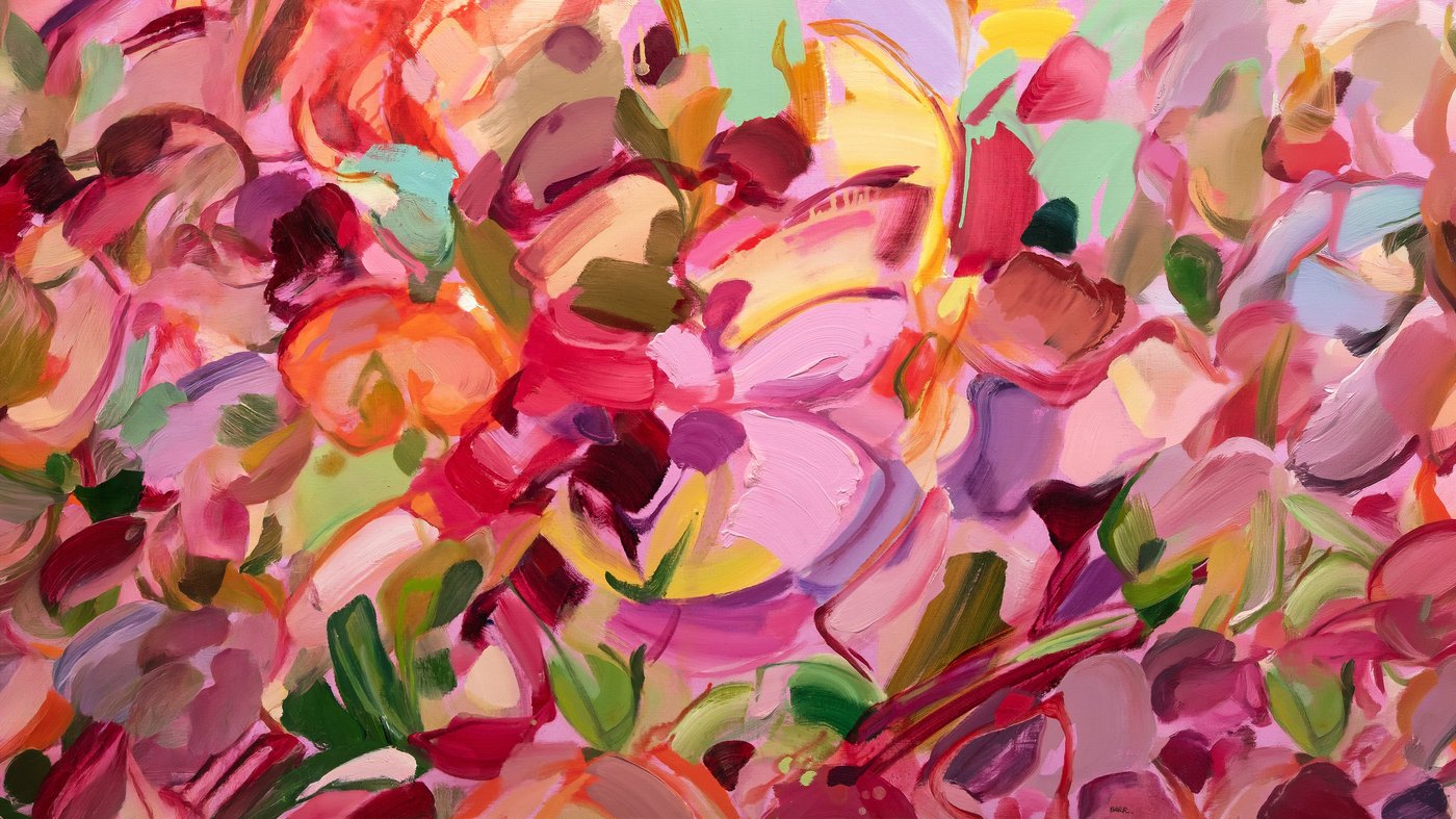 What makes this piece particularly joyful is how Barr embraces the chaos of nature rather than trying to tame it. The flowers overlap and intermingle, creating a dense tapestry where individual blooms emerge and recede into the colorful mass. The green leaves peek through here and there, grounding all that pink exuberance. It's the kind of painting that captures the overwhelming abundance you might feel standing in a garden at the height of spring, when flowers seem to multiply before your eyes and color becomes almost intoxicating.