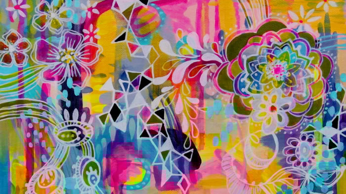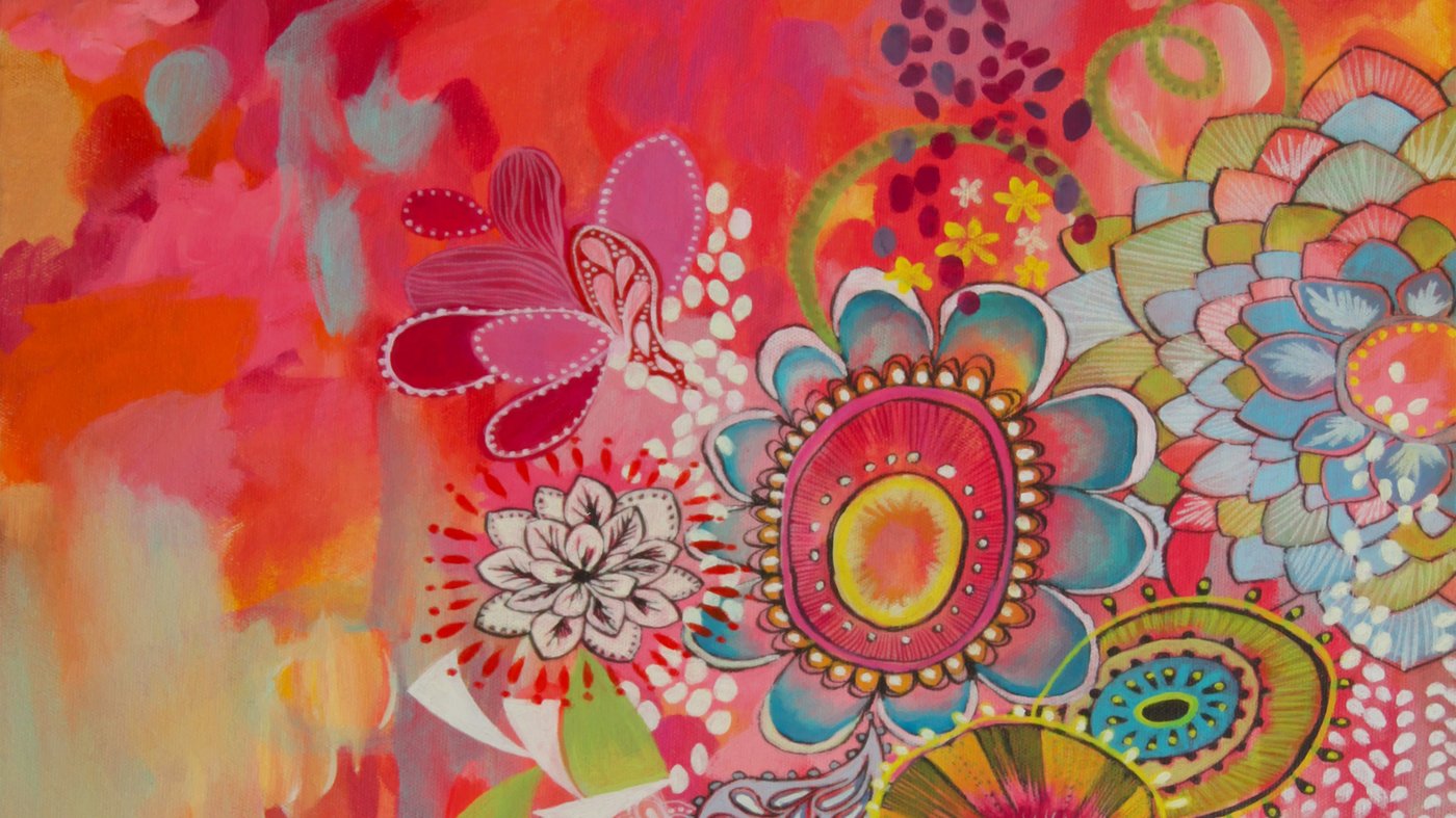 This vibrant piece bursts with the kind of joyful energy you might find in a well-loved sketchbook or a cheerful greeting card. Artist Stephanie Corfee combines loose, watercolor-like washes of pink, orange, and yellow on one side with intricate, hand-drawn patterns on the other. The result feels like watching someone's creative process unfold, where spontaneous color splashes meet carefully crafted floral mandalas and decorative motifs. Each flower and geometric shape is outlined in contrasting colors, giving the detailed section a playful, almost folk-art quality.