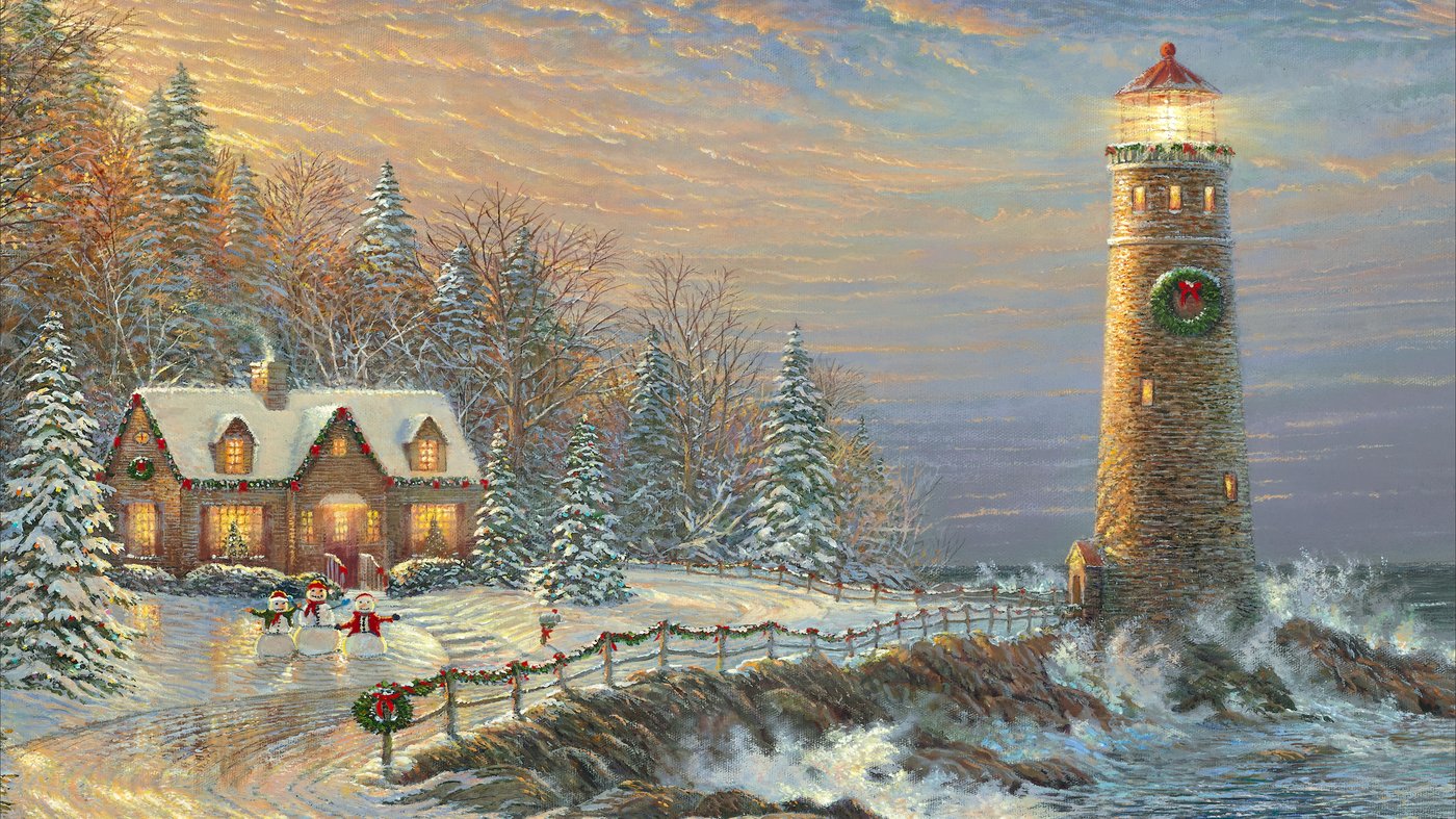 Kinkade often used lighthouses as symbols of guidance and protection, and here that meaning is softened by the season. The light feels welcoming rather than urgent, offering reassurance in the cold and darkness. The scene balances shelter and exposure, home and sea, celebration and quiet. It reflects a sense of hope and continuity, suggesting that warmth and care can remain steady even at the edge of winter.