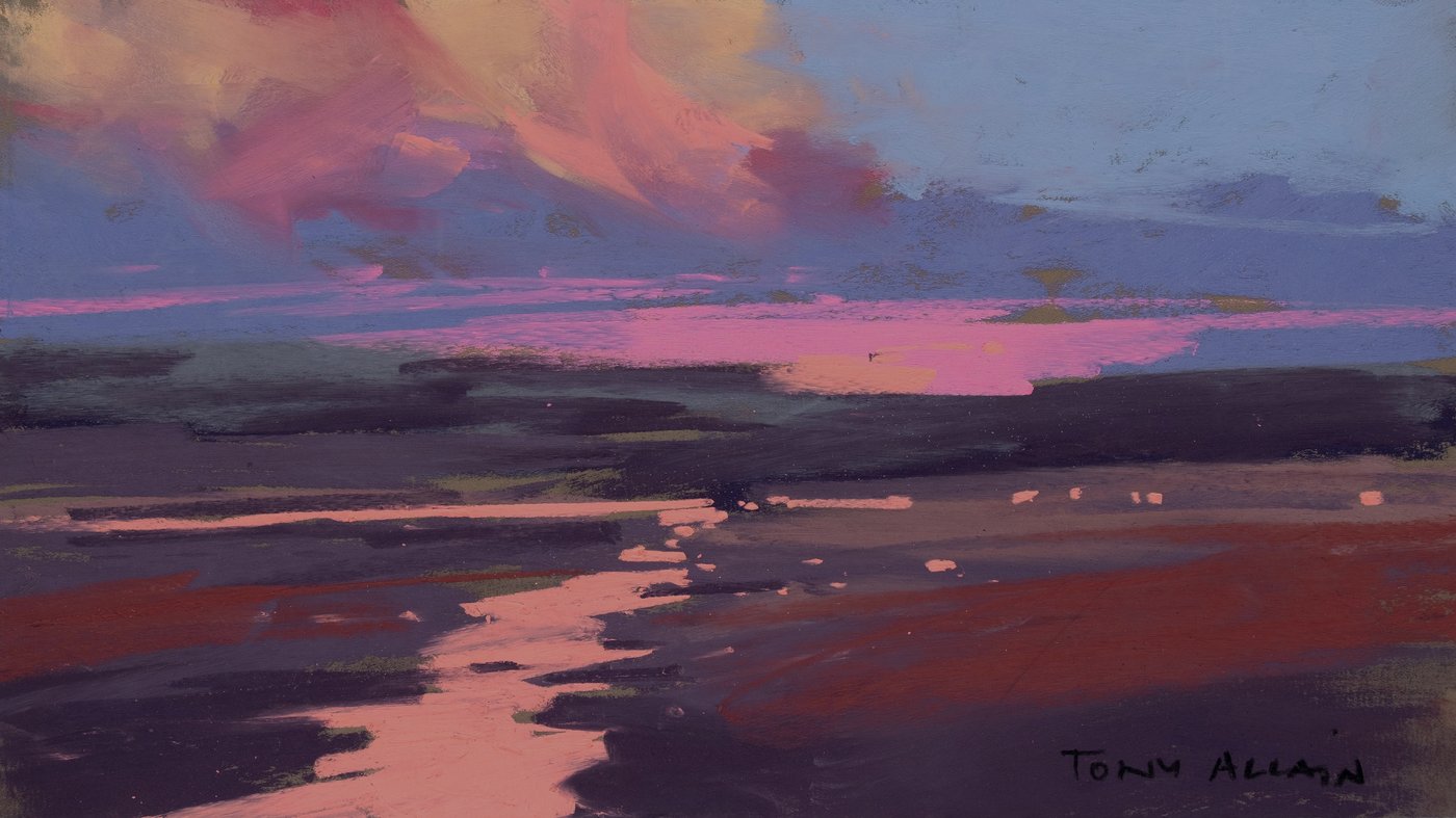 This atmospheric landscape captures the River Garry in Scotland at what appears to be either dawn or dusk, when the sky erupts in shades of pink and purple. The artist has used bold, expressive brushstrokes to convey the way light reflects off the water's surface, creating striking ribbons of pink that mirror the dramatic clouds above. The dark landmasses frame the luminous water, emphasizing the contrast between earth and sky during these fleeting moments of the day. Tony Allain works in a contemporary impressionistic style, focusing on capturing the essence and mood of a scene rather than precise details. The River Garry flows through the Scottish Highlands, an area known for its rugged beauty and ever-changing light conditions. This painting demonstrates how effectively simple color relationships and loose brushwork can evoke a sense of place and the particular quality of Highland evenings, where the landscape seems to hold onto light even as darkness approaches.