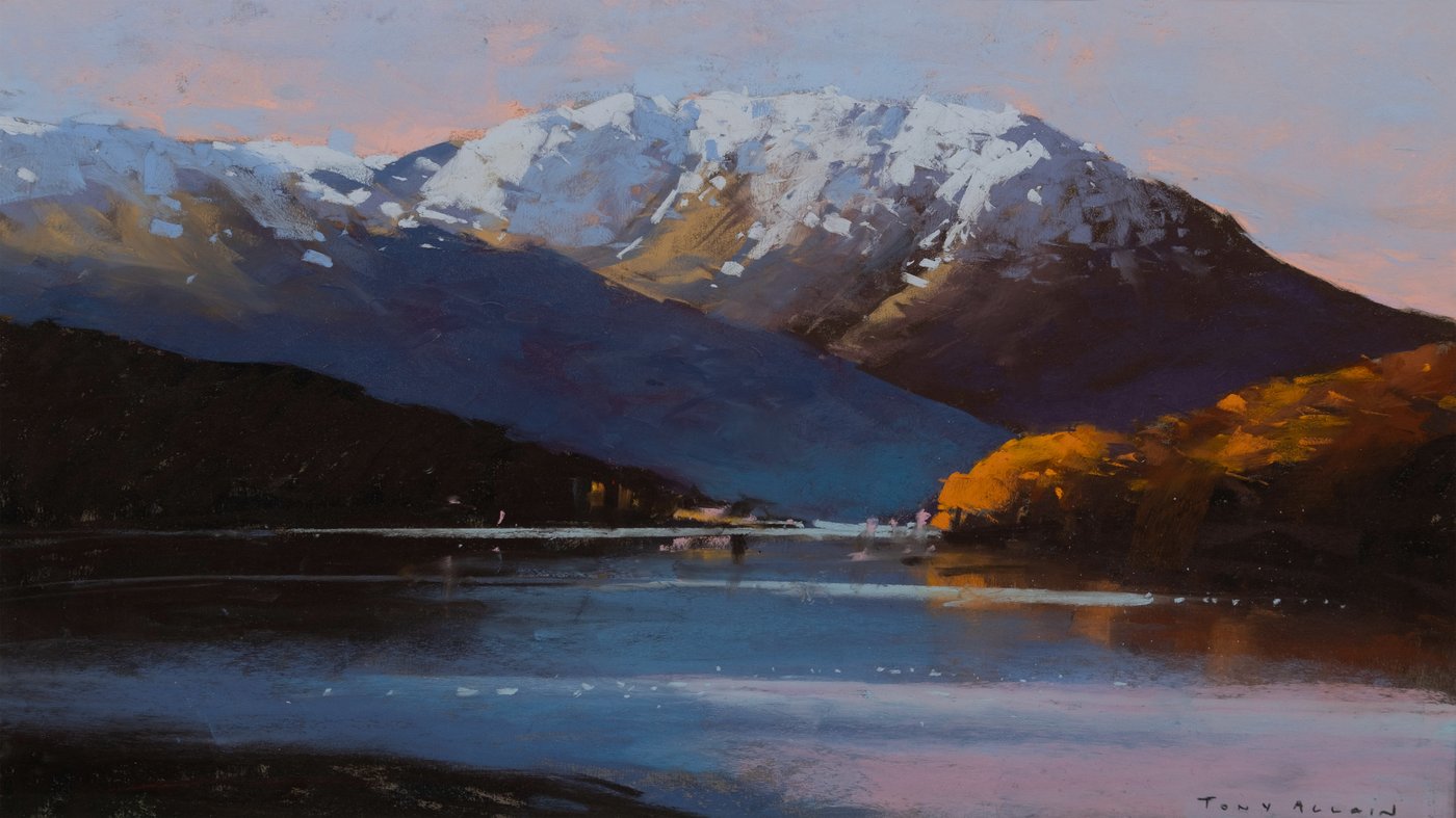 This sweeping landscape captures the rugged beauty of the Scottish Highlands with a refreshingly direct approach. Snow-capped mountains dominate the background while their slopes cascade down in rich browns and golds toward a peaceful loch that mirrors the soft pink and blue tones of the sky. The painting has an impressionistic quality, with loose, confident brushwork that suggests details rather than spelling them out. Tony Allain's work celebrates the dramatic Scottish wilderness without getting too precious about it. The composition draws your eye naturally from the darker foreground across the still water to those majestic peaks, creating a sense of depth and scale that reminds you why people have been painting these landscapes for centuries. There's something honest and unpretentious here, a straightforward appreciation for a beautiful place captured in paint, with just enough atmospheric mood from that evening light to make it memorable.