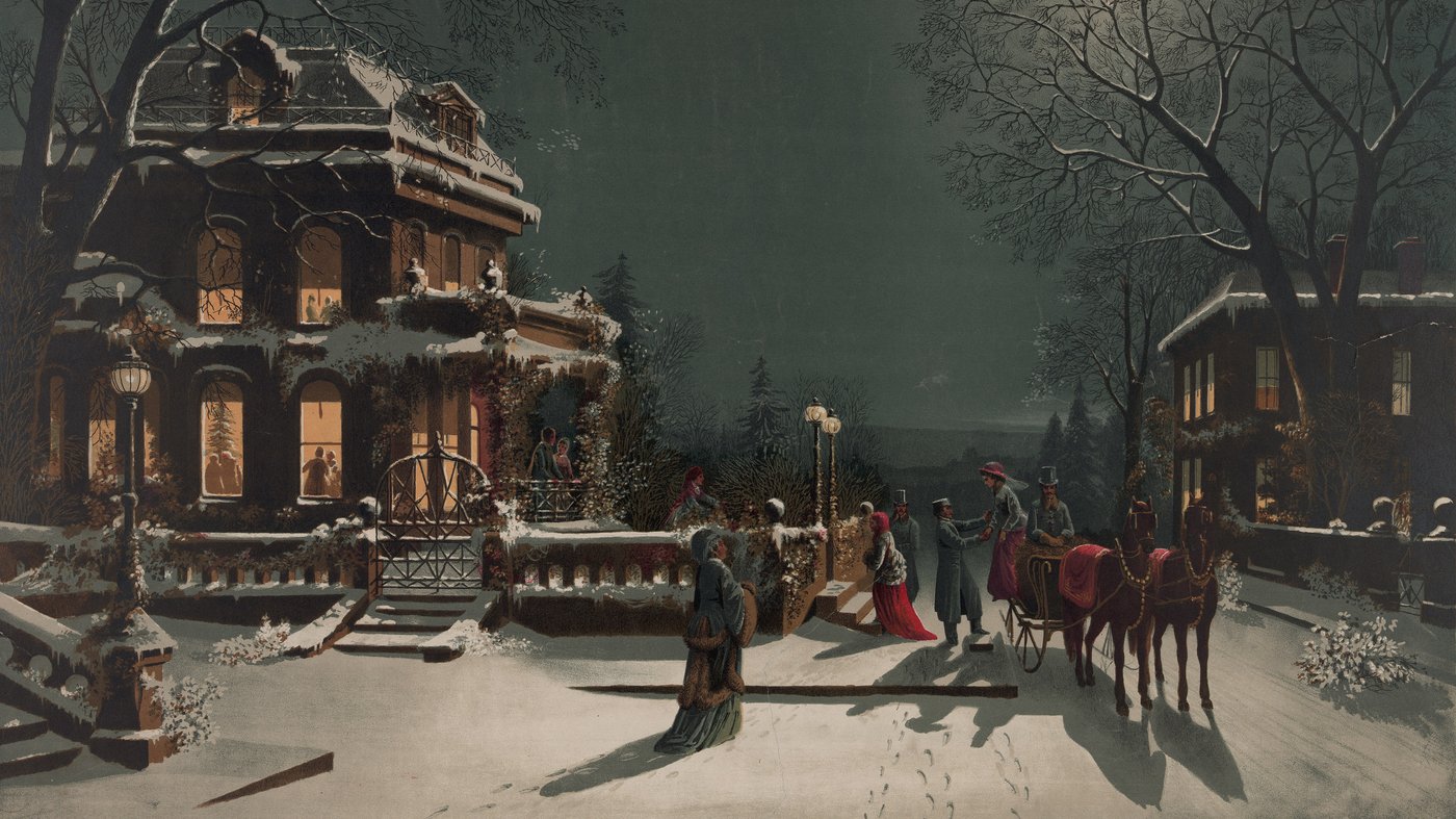 Christmas Eve captures the quiet anticipation that settles just before night fully arrives. Snow blankets the street and rooftops, softening sound and movement, while warm light spills from the windows of the house and nearby buildings. A small group gathers near a horse drawn carriage, their slow gestures suggesting greetings, departures, or arrivals. Nothing feels rushed. The moment exists in the space between events.