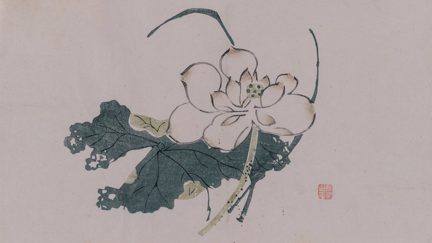 This delicate painting captures the elegant simplicity of East Asian brush painting, where a single lotus flower and its broad leaf float against an empty background. The artist has used careful ink washes to create the deep green of the textured leaf, contrasting beautifully with the pale, almost translucent petals of the bloom. A red seal stamp in the lower right corner is a traditional mark of authenticity and authorship in Asian art.