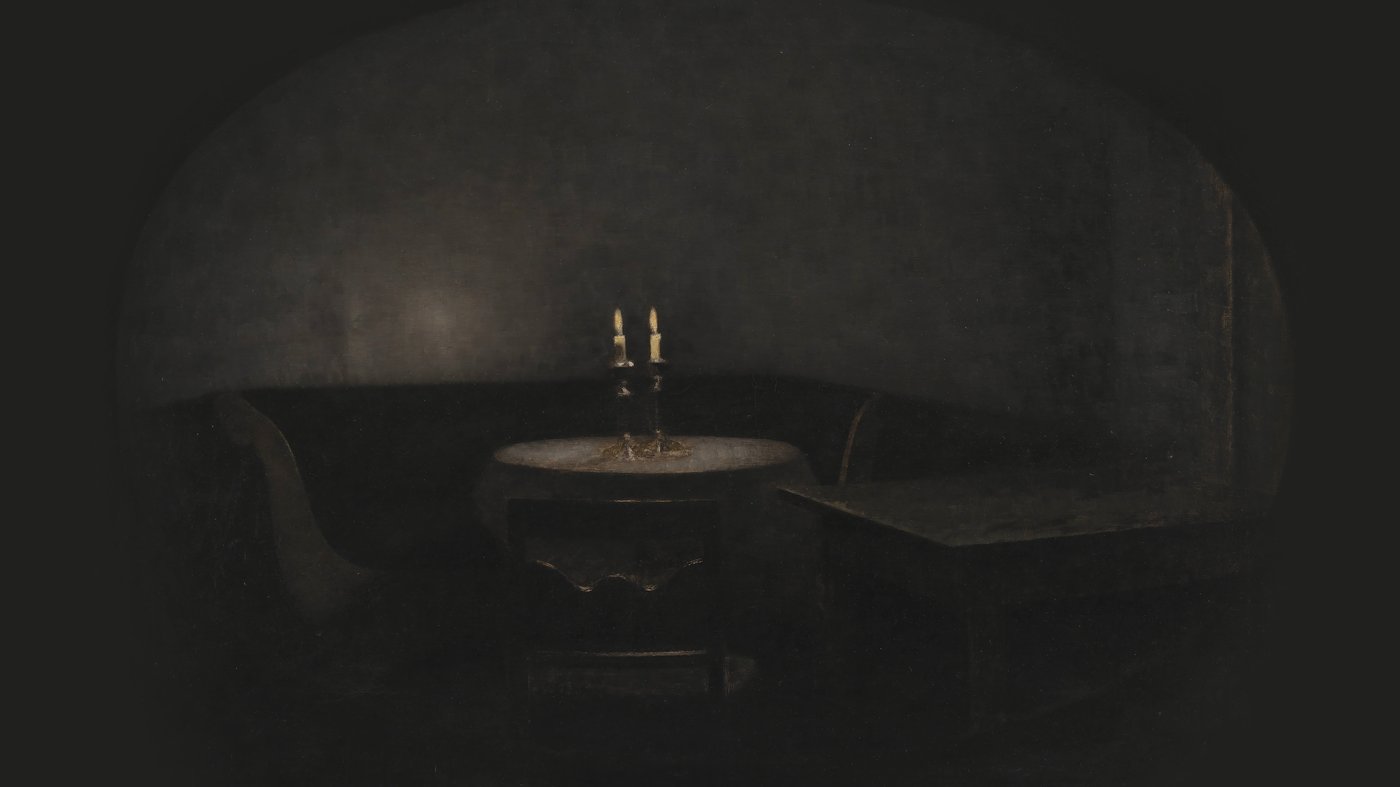 Here's a quietly mysterious scene that draws you into its shadowy depths. Danish painter Vilhelm Hammershøi created this moody interior around the turn of the 20th century, capturing a sparsely furnished room lit only by two candles on a round table. The dim glow barely pushes back the darkness, making the surrounding space feel almost dreamlike and uncertain. Two chairs sit waiting on either side of the table, though no one occupies them.