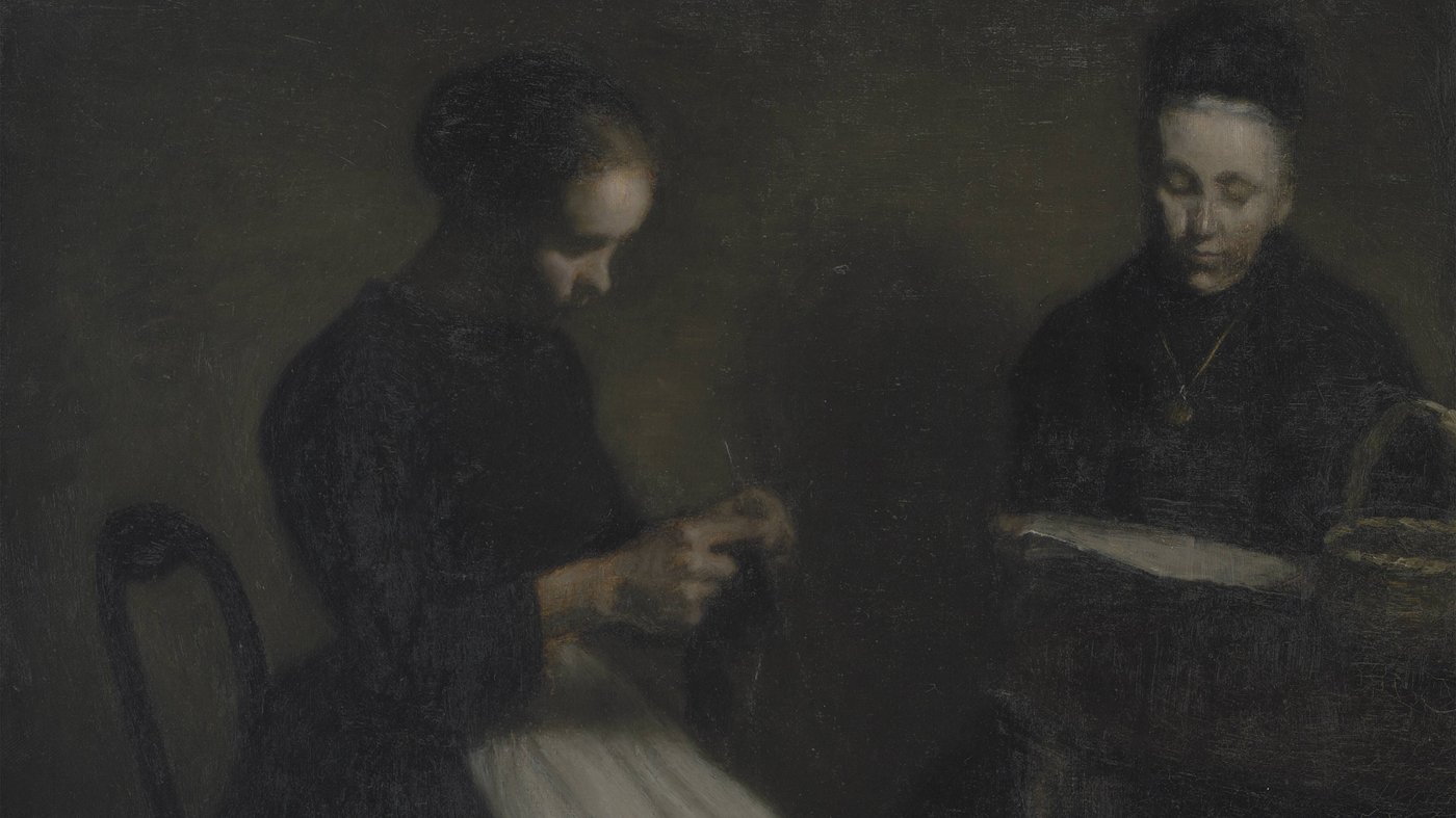 This intimate scene captures a quiet moment between two women absorbed in their own activities, bathed in the subdued light characteristic of Danish painter Vilhelm Hammershøi's work. The artist has depicted his mother and wife in their drawing room, both dressed in dark clothing that blends into the muted, almost monochromatic palette. One woman appears to be sewing while the other reads, their downcast faces creating a sense of introspection and solitude even in shared space.