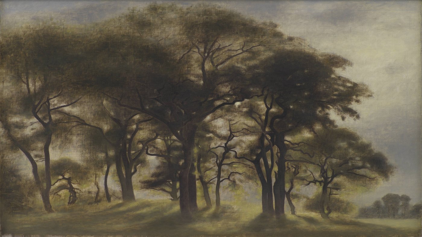 This atmospheric landscape captures a grove of old trees in Denmark's Jægersborg Deer Park, a royal hunting ground north of Copenhagen. Painted by Vilhelm Hammershøi, an artist best known for his quiet, contemplative interior scenes, this work shows his equal skill at capturing the subtle moods of nature. The trees stand like weathered sentinels, their gnarled branches spreading wide against a muted, overcast sky that feels distinctly Scandinavian.