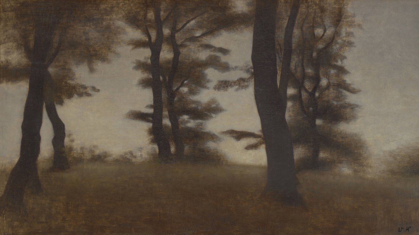 Vilhelm Hammershøi, one of Denmark's most celebrated painters, was known for his subdued color palette and contemplative approach to everyday subjects. While he's most famous for his spare, silent interiors of empty rooms, this landscape shows he brought the same hushed sensibility to nature. There's something melancholic about the way he captures these trees, stripping away bright colors and details to focus on form, light, and atmosphere. It's the kind of painting that asks you to slow down and appreciate the beauty in simplicity and quiet moments.
