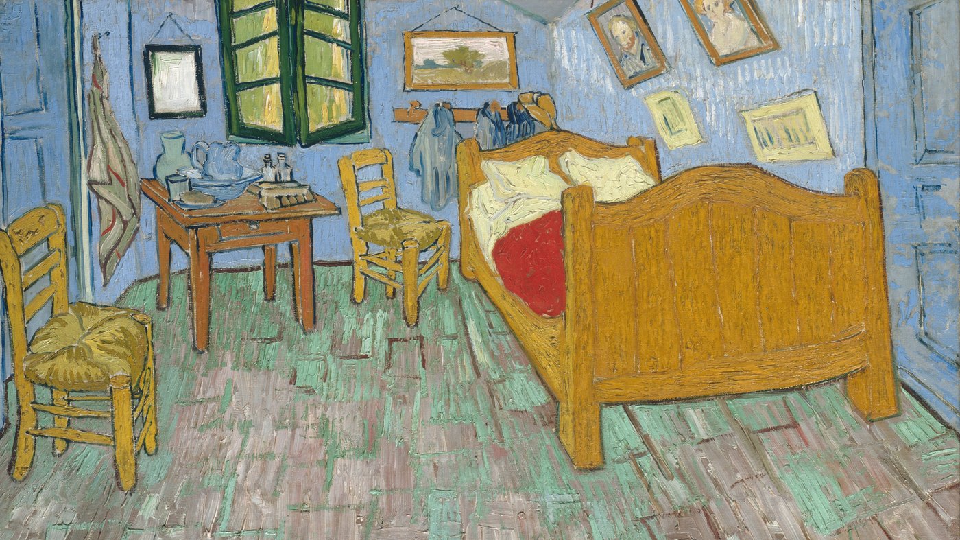 This is Vincent van Gogh’s painting of his own bedroom in the Yellow House in Arles, from 1888. He created it to give himself, and the viewer, a sense of absolute rest and simplicity.