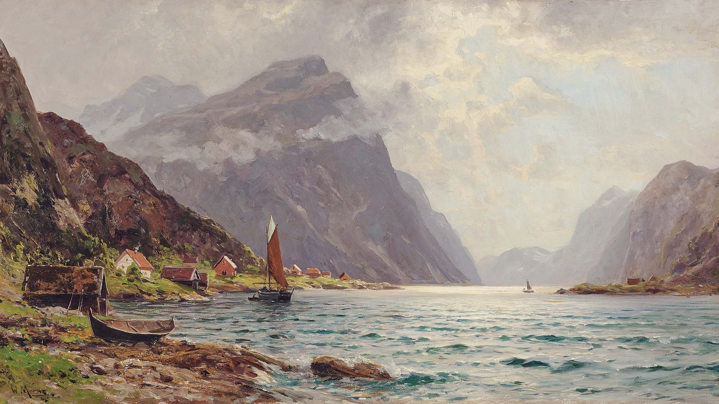 A quiet fjord stretches between towering mountains, their slopes softened by mist and shifting light. Moras treats the landscape with a calm steadiness, focusing on the balance between the immense scale of nature and the small human presence along the shore. The cluster of houses and the anchored boats feel almost sheltered by the cliffs, as if resting under their protection.