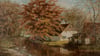 This peaceful scene captures a traditional farmstead in the Spreewald region of Germany, where networks of waterways wind through the countryside like liquid roads. Walter Moras painted this work with a naturalistic eye, focusing on the warm autumn colors of the prominent tree that dominates the composition. The white farmhouse sits quietly behind the foliage, its reflection shimmering in the still water that flows past the property. It's the kind of place where boats were as common as carts for getting around.
