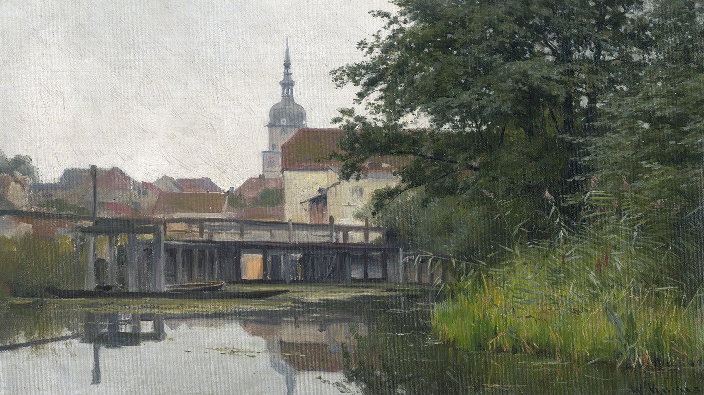 View in the Lübben Castle Quarter with a look across the Spree toward the Paul Gerhardt Church
