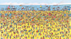 This particular beach scene is vintage Waldo at its finest: an absolutely packed stretch of sand and sea where hundreds of tiny figures are swimming, sunbathing, playing games, and getting up to all sorts of seaside shenanigans. The brilliant yellow sand contrasts with the blue water, while deck chairs, beach umbrellas, boats, and inflatable toys create a delightful chaos that demands close inspection. Somewhere in this cheerful mayhem, Waldo is hiding along with his friends and various hidden objects, waiting patiently for you to spot him among the crowd.