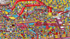 This wonderfully chaotic scene plunges you into a bustling candy factory where literally hundreds of tiny figures crowd every available space. Created in the distinctive style of the beloved "Where's Waldo?" series by British illustrator Martin Handford, the image transforms a simple factory setting into an impossibly busy wonderland of activity. Red conveyor belts snake through the composition like arteries, connecting different stages of candy production while workers in their characteristic striped shirts and colorful clothing scramble about their tasks.