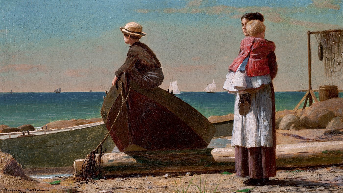 Painted during Homer’s time in the English fishing village of Cullercoats, the work centers on two groups of figures on the beach: a young woman holding a small child, and a boy perched atop an upturned boat. They are all gazing intently out to sea, waiting for the fishing fleet to return. This is less about action and more about mood and emotional tension.