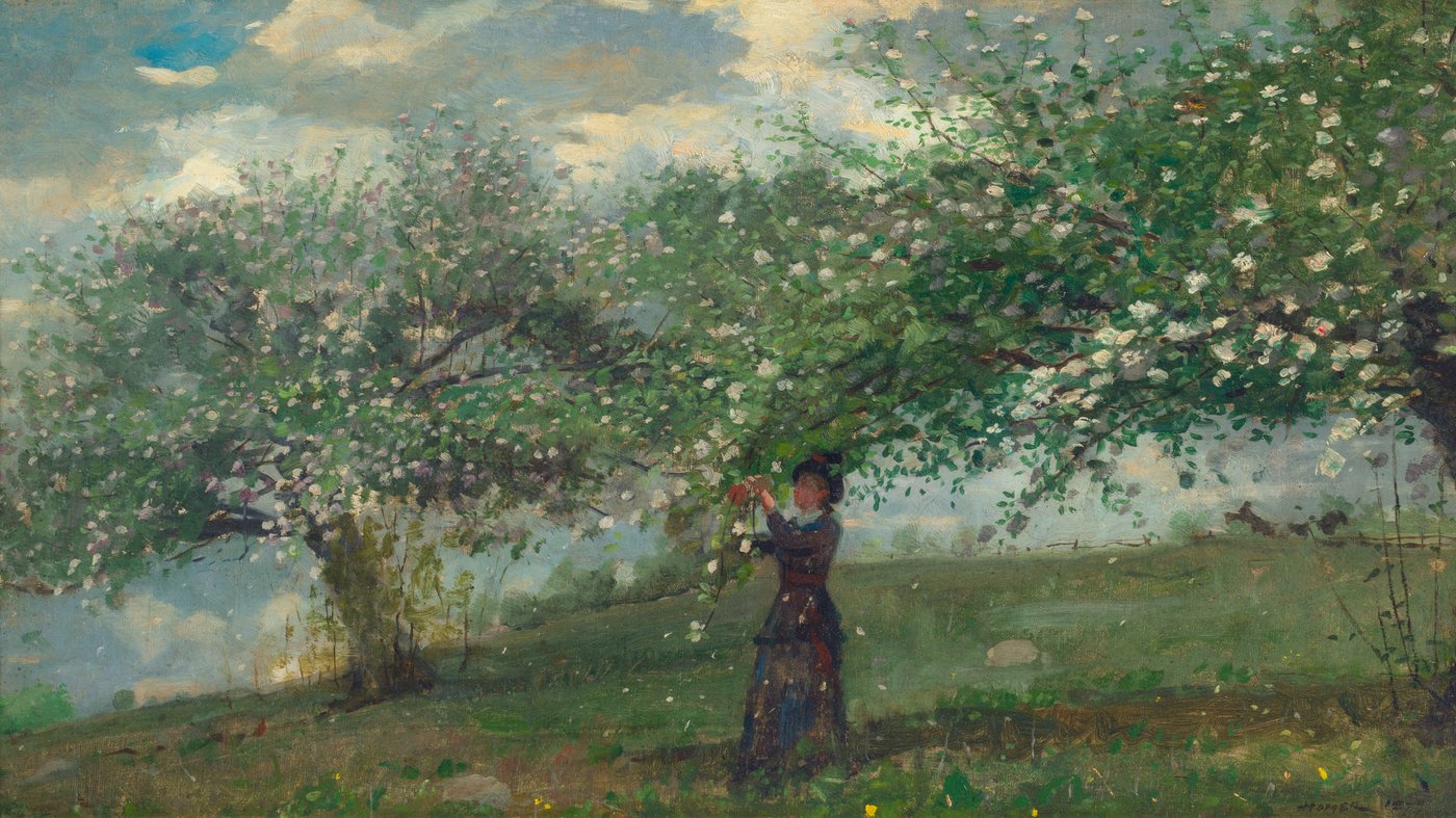 Winslow Homer’s "Girl Picking Apple Blossoms" (1878) belongs to a series of paintings he created during the 1870s that focused on the idealized innocence and beauty of rural American girlhood. This painting is set in a lush orchard, symbolizing natural abundance and seasonal renewal. The young girl, with her back to the viewer, is intent on her task, suggesting a sense of quiet industry and unspoiled virtue. In the post-Civil War era, when America was rapidly urbanizing and becoming industrialized, scenes like this offered a nostalgic escape and represented a simple, moral life tied to the land. The apple blossom itself is a symbol of spring, fertility, and fragile, fleeting beauty. Homer uses soft, dappled light and bright colors to capture this moment, offering a tender visual affirmation of hope and stability through the timeless activities of childhood and nature. It is a painting about cherishing simple, agrarian values.