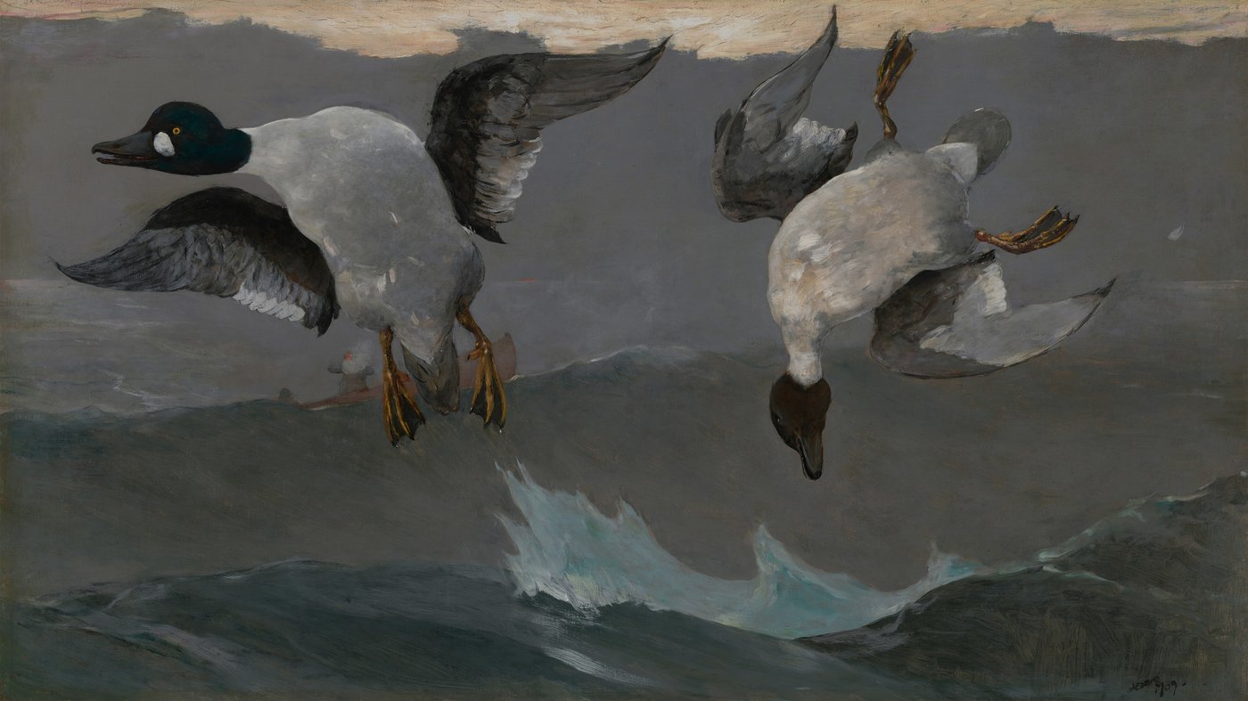 Homer spent his later years living on the rugged Maine coast, and his deep understanding of the ocean's moods shows in every brushstroke of those grey-green waves. The painting carries an unsettling honesty about it. There's no sentimentality here, just the stark reality of hunting and survival. The stormy sky and rough waters create a somber atmosphere that matches the subject matter. What makes it particularly striking is how Homer painted these birds with such care and detail even as he depicted their final moments, showing both the beauty of these creatures and the harsh realities of nature and human activity.