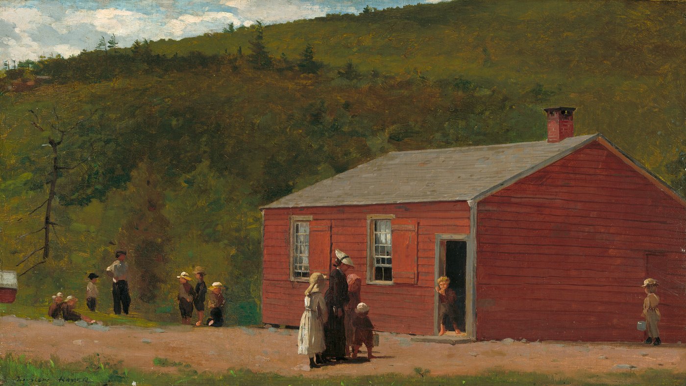 The painting depicts a group of country schoolgirls gathered outside a plain, clapboard schoolhouse, waiting for lessons to begin or perhaps enjoying a recess moment. Homer often focused on children during this period, viewing them as symbols of the nation's future and resilience. The girls stand together, forming a self-contained group, emphasizing the importance of female education and community in rural settings.