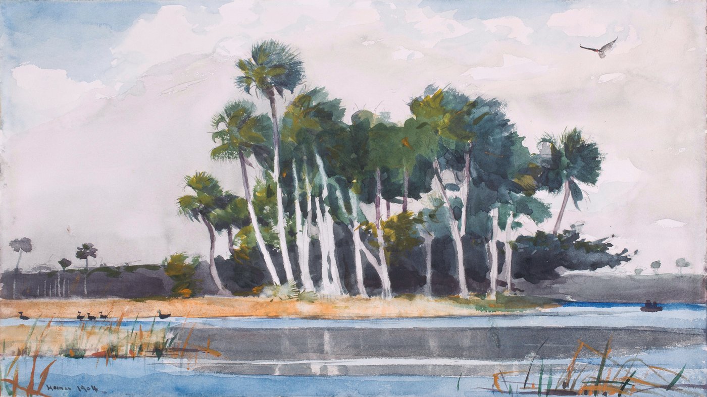 This watercolor captures a serene Florida landscape with its characteristic palm trees rising like white columns against a clouded sky. Winslow Homer painted this scene during his winter travels to Florida in the 1880s and 1890s, when he sought warmer climates and new subjects to explore. The turkey buzzard of the title appears as a small dark silhouette circling in the upper right corner, almost easy to miss against the expansive sky.