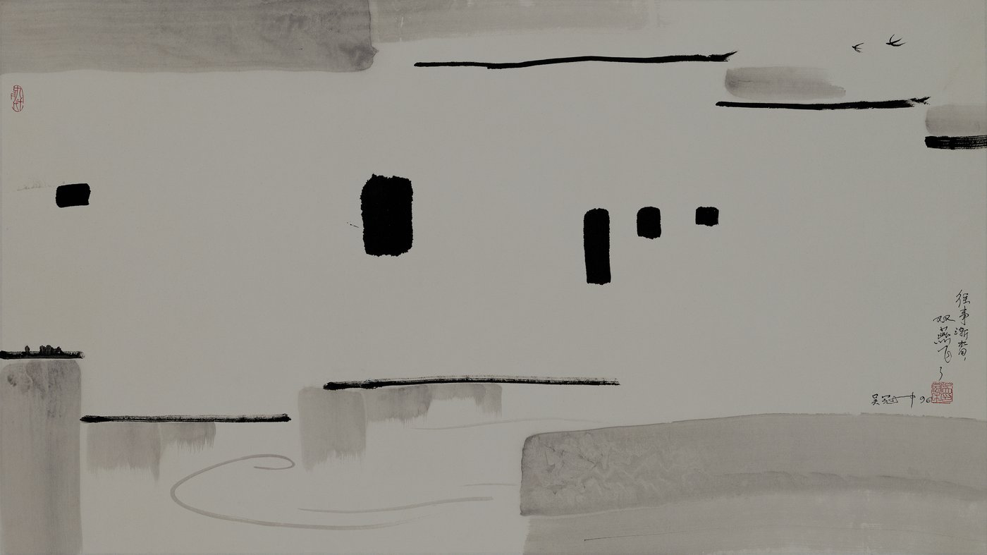 Wu Guanzhong's "Reminiscence of Jiangnan" is a modern and highly influential interpretation of a classic Chinese subject: the beautiful, water-rich region south of the Yangtze River. Wu combined traditional Chinese ink painting techniques with the abstract formal language of Western modernism. This piece captures the characteristic landscape of Jiangnan—white-walled houses, black tile roofs, and winding waterways—not through detailed realism, but through geometric abstraction and fluid lines. The strong contrasts of black ink on white space, punctuated by sparse green and blue, convey the region's quiet, moist atmosphere and unique architecture. It reflects Wu's life-long mission to create a national modern art, taking familiar Chinese scenery and translating it into a universal visual poetry that is both deeply rooted in history and radically contemporary. It is a painting about cultural memory translated through the lens of modern abstraction.
